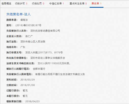 另外,微网信通重要控股子公司深圳优派移动通信有限公司(统一社会信用代码:914403000879700259)在2018年4月23日已被列为失信黑名单。相关信息可根据信用中国(https://www.creditchina.gov.cn)进行查询。