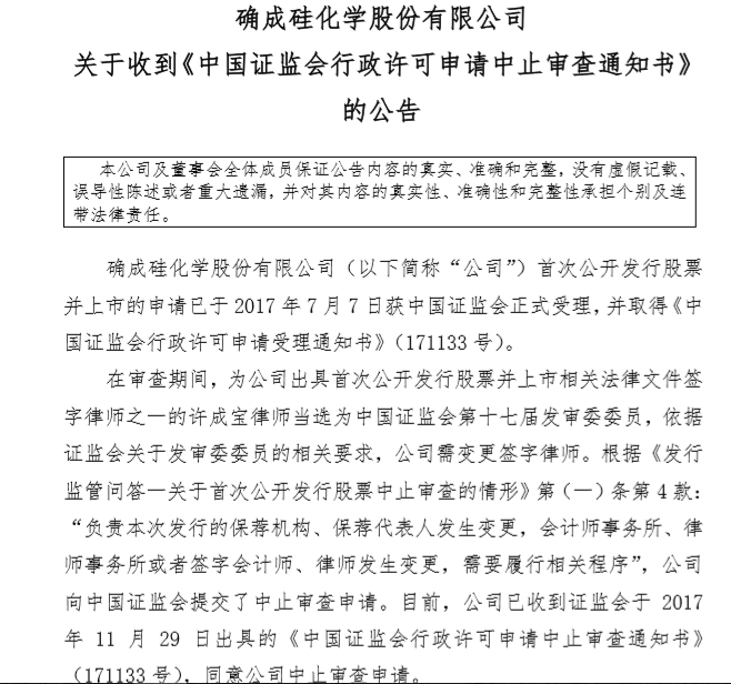 2017年12月1日,确成硅化学股份有限公司(证券简称:确成硅化,证券代码:833656.OC)发布了《关于收到<中国证监会行政许可申请中止审查通知书>的公告》(以下简称:《中止审查通知书》)。