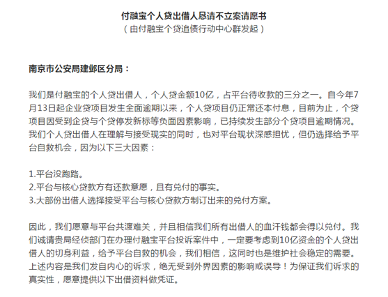 关于延期兑付,平台请求“不立案”一事,有不同声音传出。某公众号有来自付融宝个人贷出借人恳请不立案的请愿书,称因“平台没跑路;平台与核心贷款方有还款意愿,且有兑付事实等”选择给予平台自救机会。